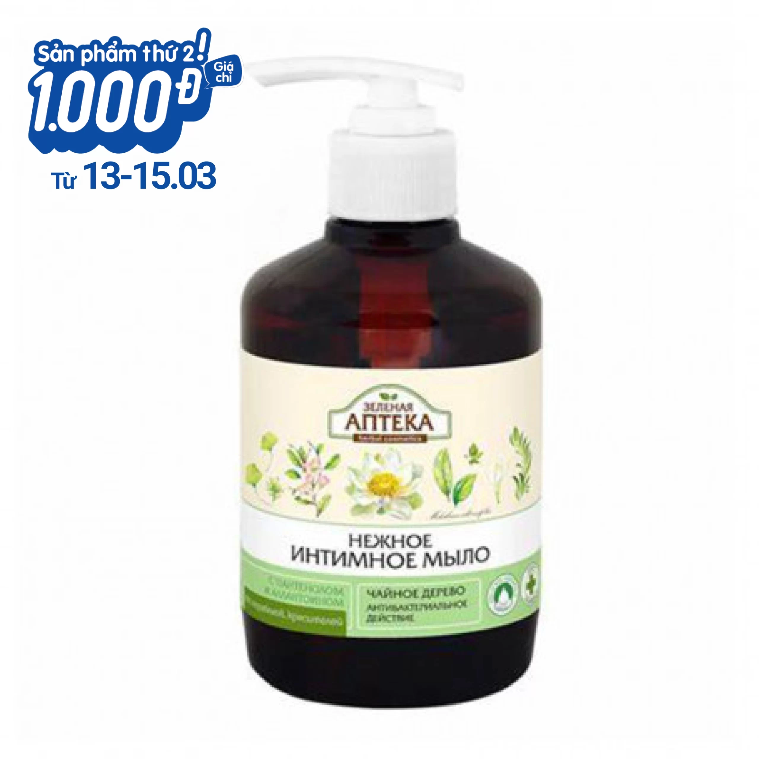 Dung dịch vệ sinh phụ nữ kháng khuẩn chiết xuất cây trà Zelenaya Apteka giúp làm sạch vùng da nhạy cảm, không làm khô da, kháng khuẩn, giúp vùng kín luôn khô thoáng và sạch sẽ.
